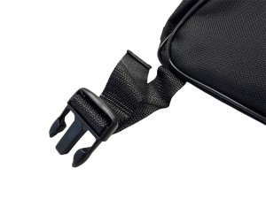 Is equipped with a zipper, handle and carrying strap.